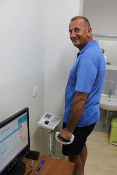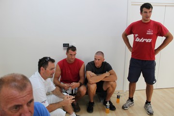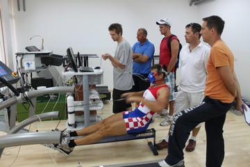 David na zagrijavanju, Martin hodom na pokretnoj traci uklanja laktate iz mišića, Kempes i Damir sjede na stroju - vibratoru (lokalni štos: pustiti webmastera da sjedne na dotični stroj, onda stroj nenajavljeno uključiti pa umrijeti od smijeha dok se webmaster trese i lovi očale i zube po zraku i parketu) |