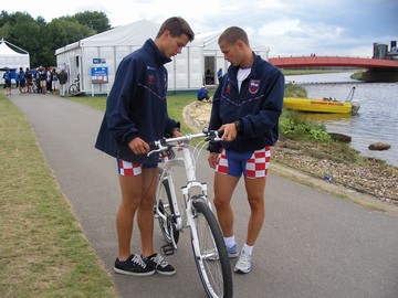 Luka i Krešo proučavaju službeni bicikl namijenjen trenerima |