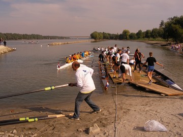 gužvu pri izlasku vode uspješno su sređivali brojni pomagači, u pozadini sudac megafonom navodi osmerce s Dunava, |